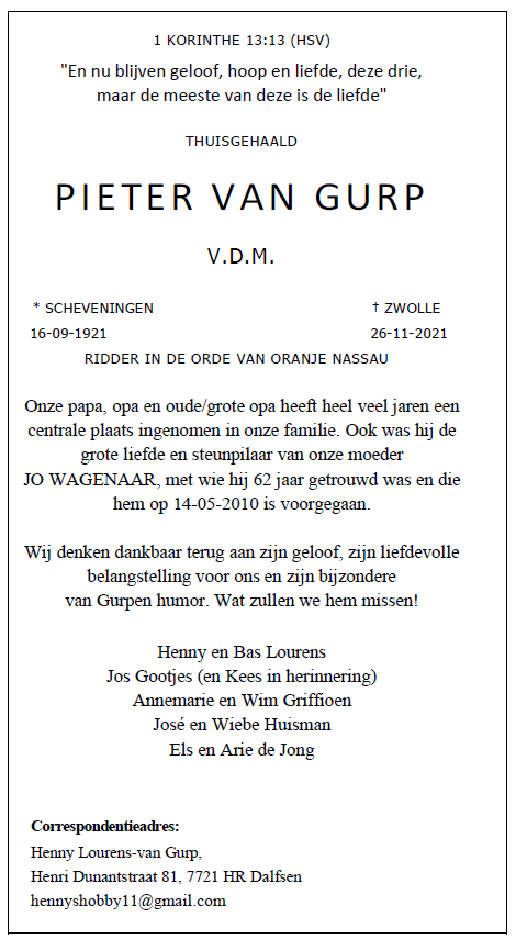 Vrijdag 26 november jl. overleed dr. P. van Gurp, emeritus predikant van De Gereformeerde Kerken (hersteld).