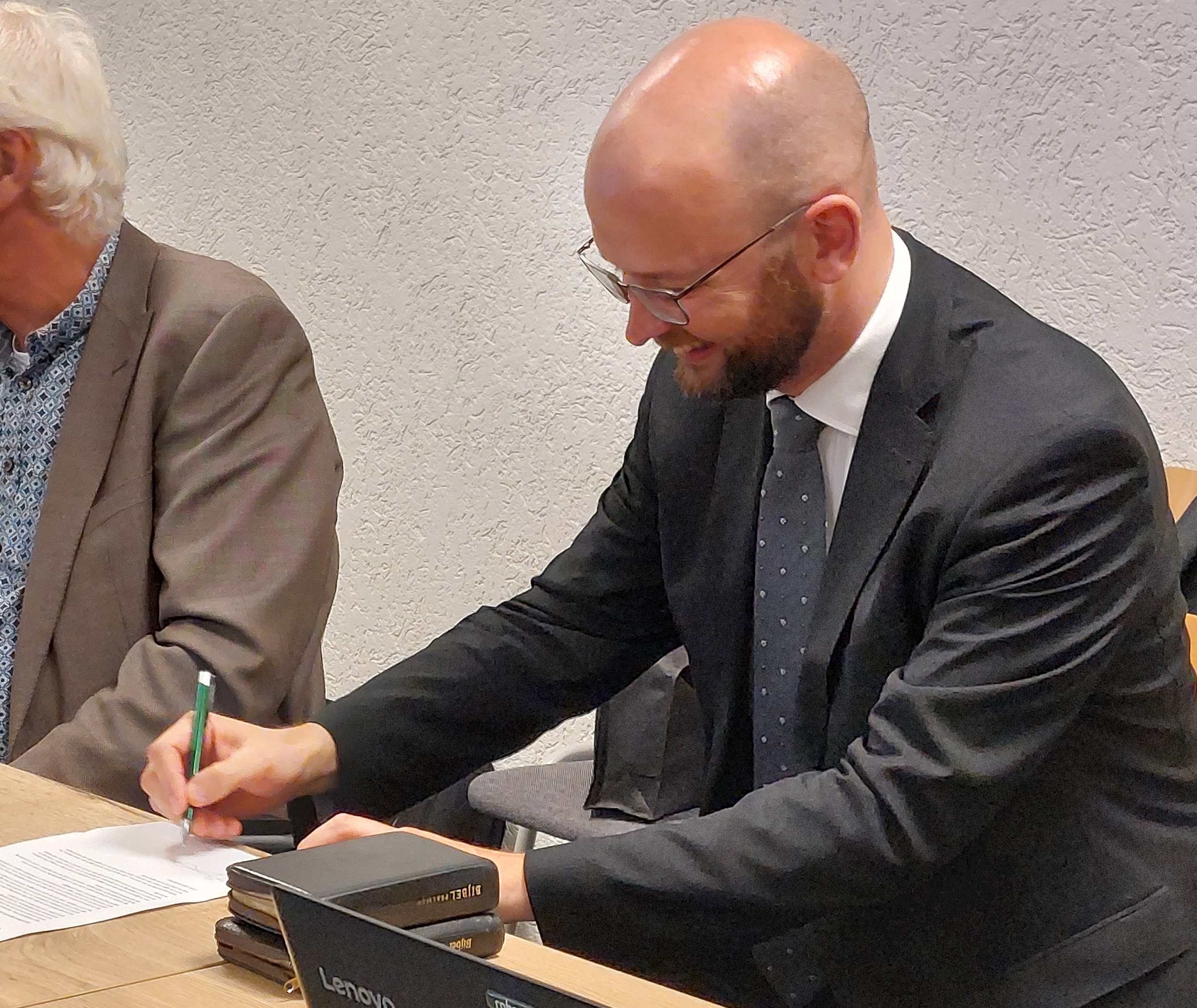 Br. D. Koster zond ons een mooie foto van het moment waarop ds. Drost zijn handtekening op het ondertekeningsformulier plaatst. Met toestemming laten we het hier zien.