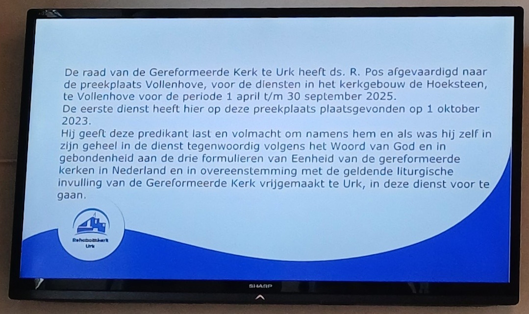 Nu heeft ook Vollenhove een middag preekplaats. Deze is eveneens georganiseerd door en valt onder verantwoordelijkheid van GKv Urk. Ds. R. Pos is gemachtigd daar de bijeenkomsten de leiden zoals het informatiescherm in het kerkgebouw uitgebreid vermeldt (machtiging inmiddels verlengd?).